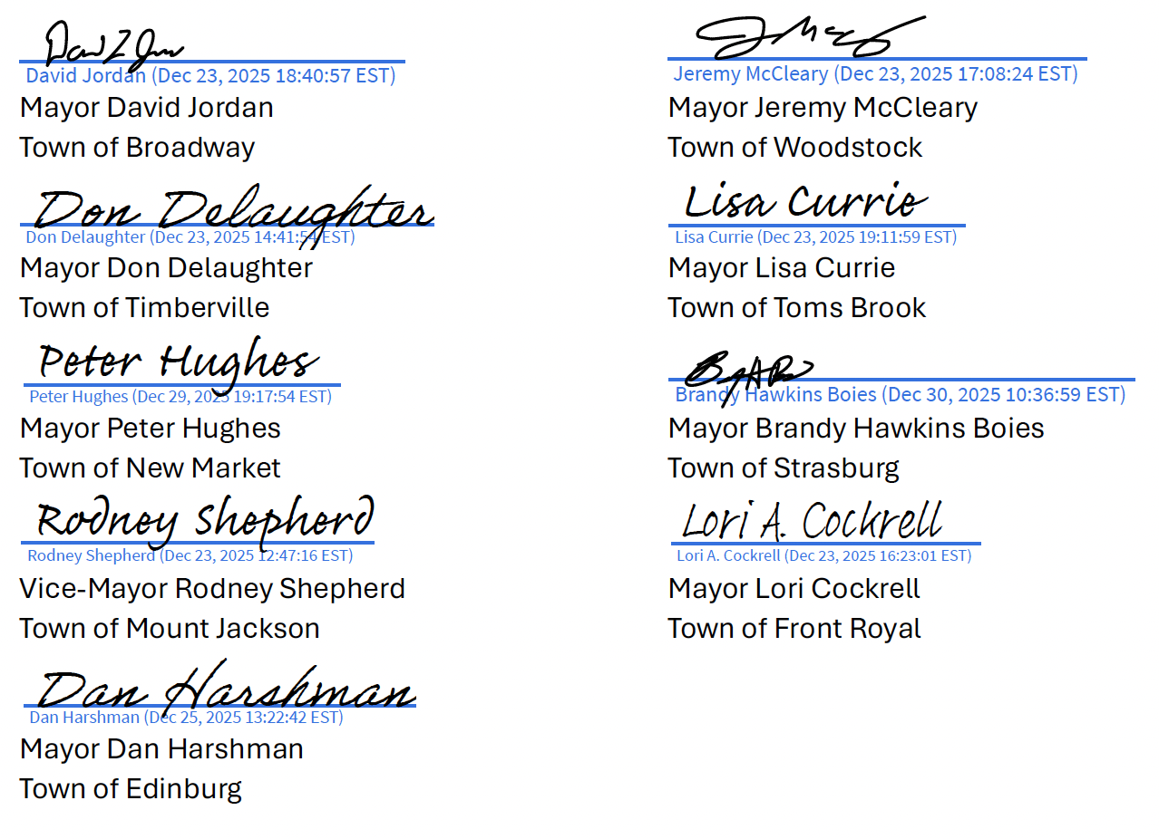 As elected representatives of the nine towns along the Shenandoah Rail Trail corridor, we ask you to defer action at your January 6 meeting on the proposal to transfer the rail-trail project and its funding to the Virginia Passenger Rail Authority. This proposal is being hurried toward an outcome that appears misaligned with our towns’ economic and quality-of-life interests, but rather is placed with a private entity that has no formal accountability to our communities.